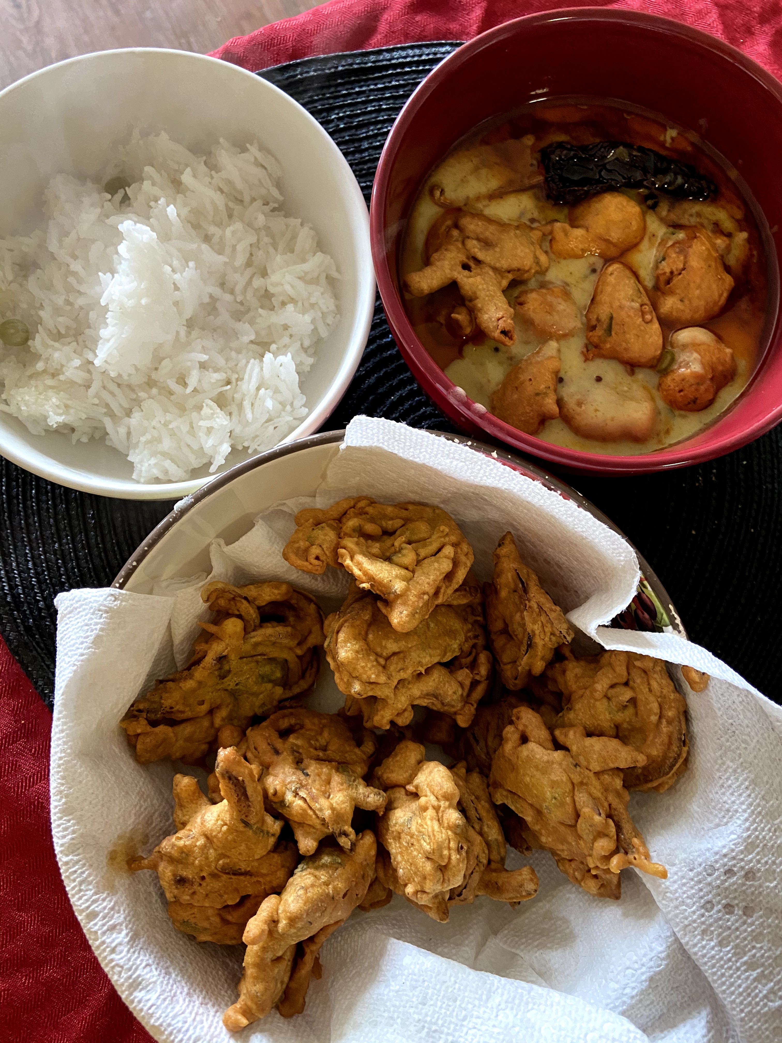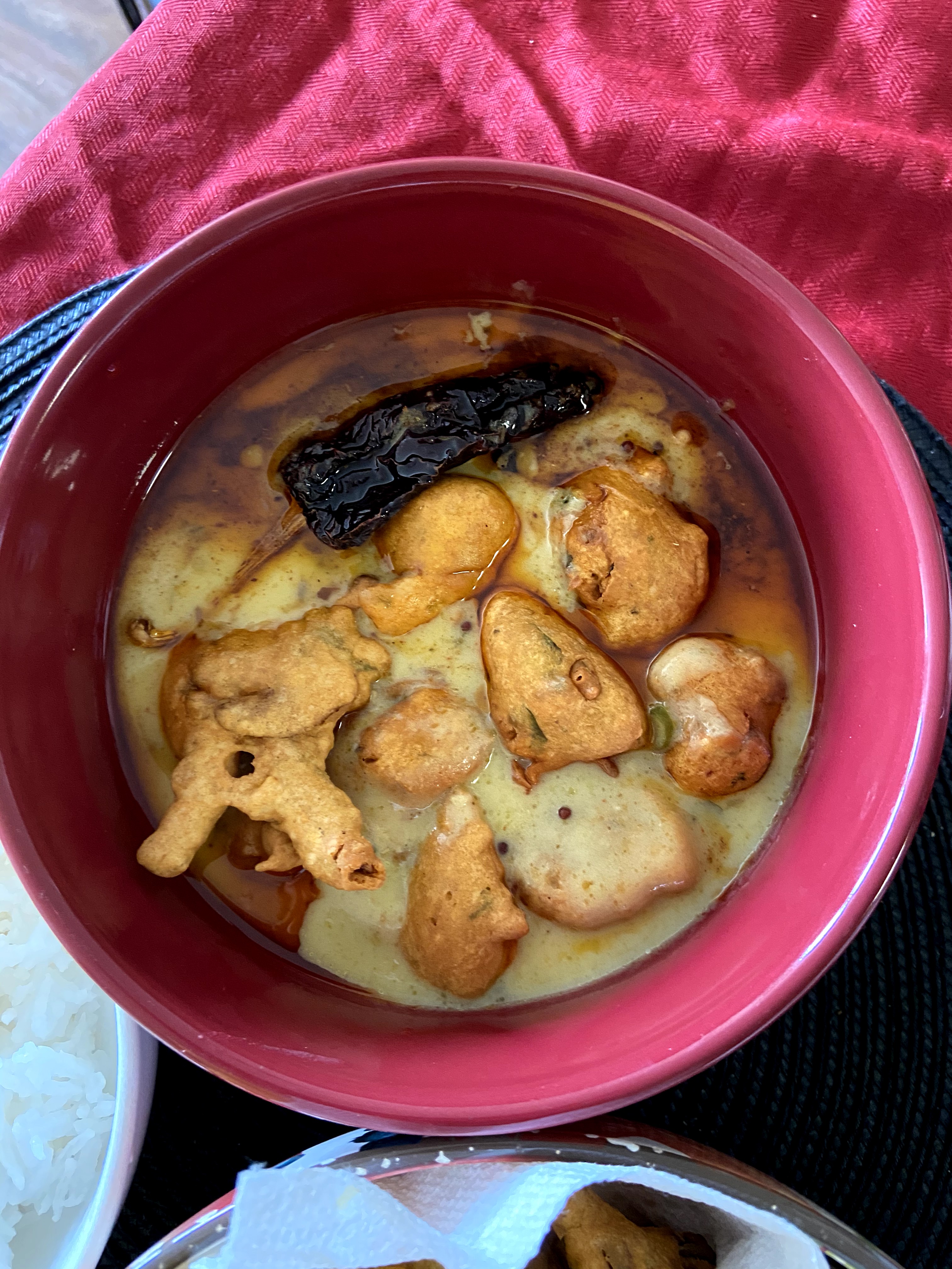 My comfort food is Kadhi Chawal. A simple yogurt based curry topped with lots of mustard seeds, curry leaves and fritters dropped in. This meal takes me home, brings me peace and I feel like a calm running through. The curry is made with yogurt, chick pea flour, the tempering is the actual trophy that brings out the flavor. A constant eye on the boiling gives the curry a kick that you do not even need a side dish to go with it. It takes a simple curry to something that triggers me back to my childhood and those endless memories with my mother. I feel blessed.